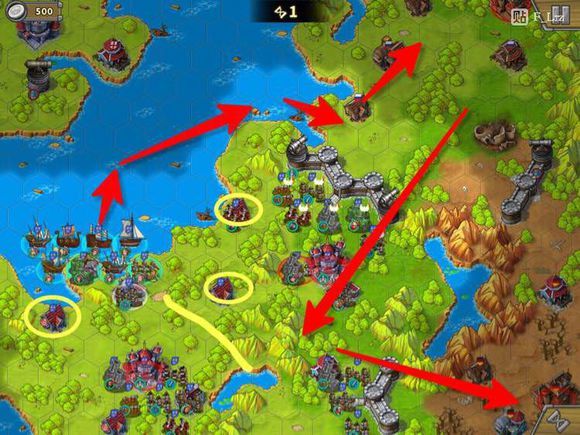 大致路线。红箭头为我军主力进攻线路,黄色圆圈代表我军杂兵需要控制的据点,线条表示杂兵需要卡住的位置。