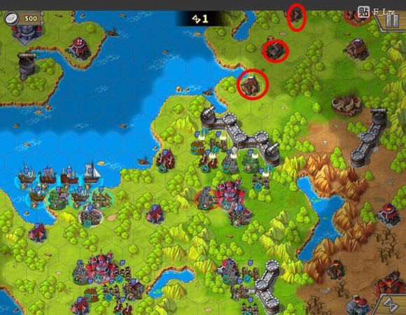 第二阶段。占领如图三个城镇,围绕三城清理掉俄罗斯无名巨炮,叶卡。选择恰当城镇上公主,补给一下主力。不要靠近红圈,后面有一个无名炮,火力很强。可以考虑用工厂出炮帮助炮将攻击红圈。