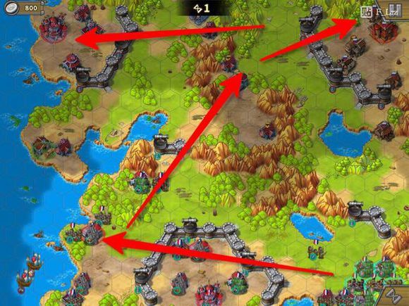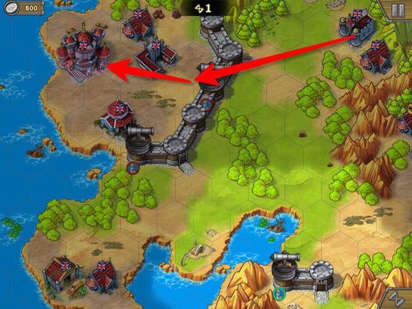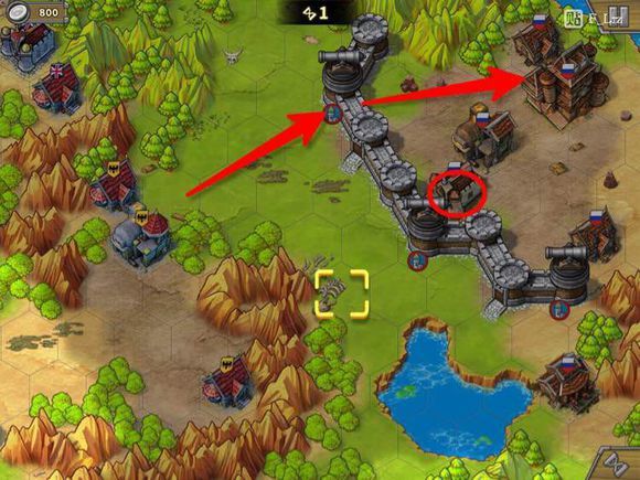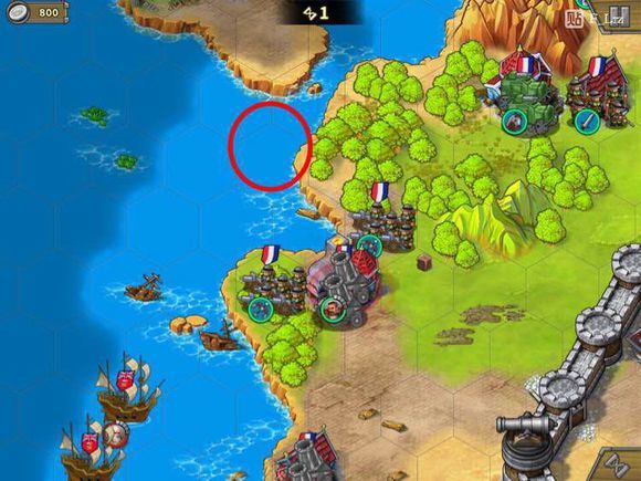 第四步。从这里向左,破城,解掉纳尔逊和红圈堡垒。城里的两个无名将会向下移动,因此我们能够完美绕过他们。
