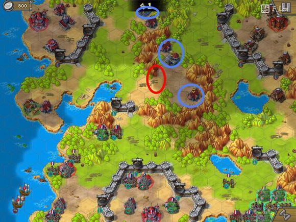 先来看这关的地图。我方一共三个红圈,拿破仑,堡垒,左边的工厂。实际上只有工厂是重要的,因为即使拿破仑和堡垒阵亡了,工厂只要在我们手里,就不会输。但如果工厂丢失,即便拿破仑和红圈堡满血,我们也无法取得胜利。