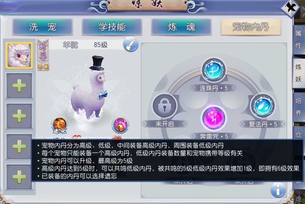玩法介绍:通过给宠物镶嵌宠物内丹,可提升宠物技能的效果