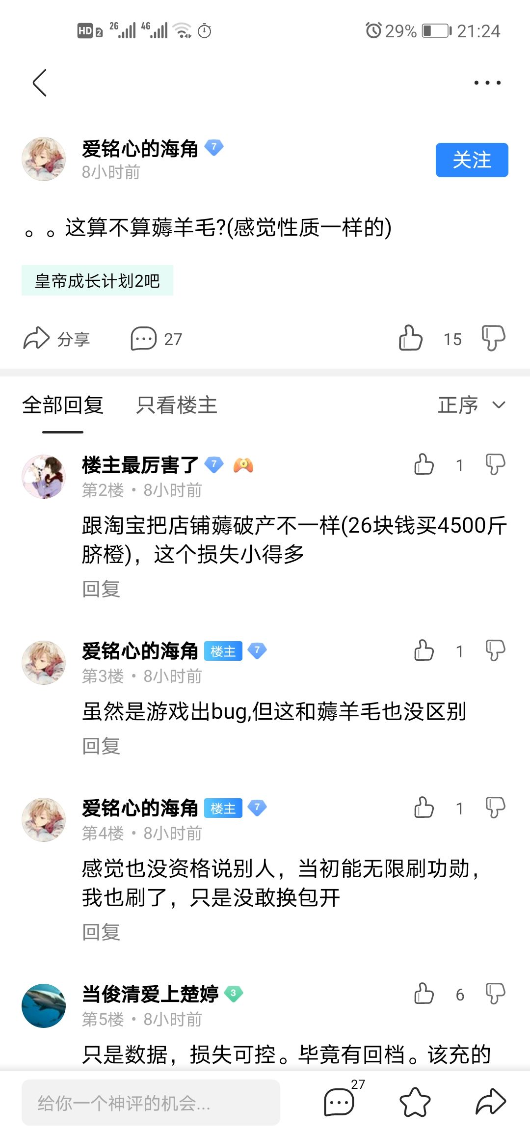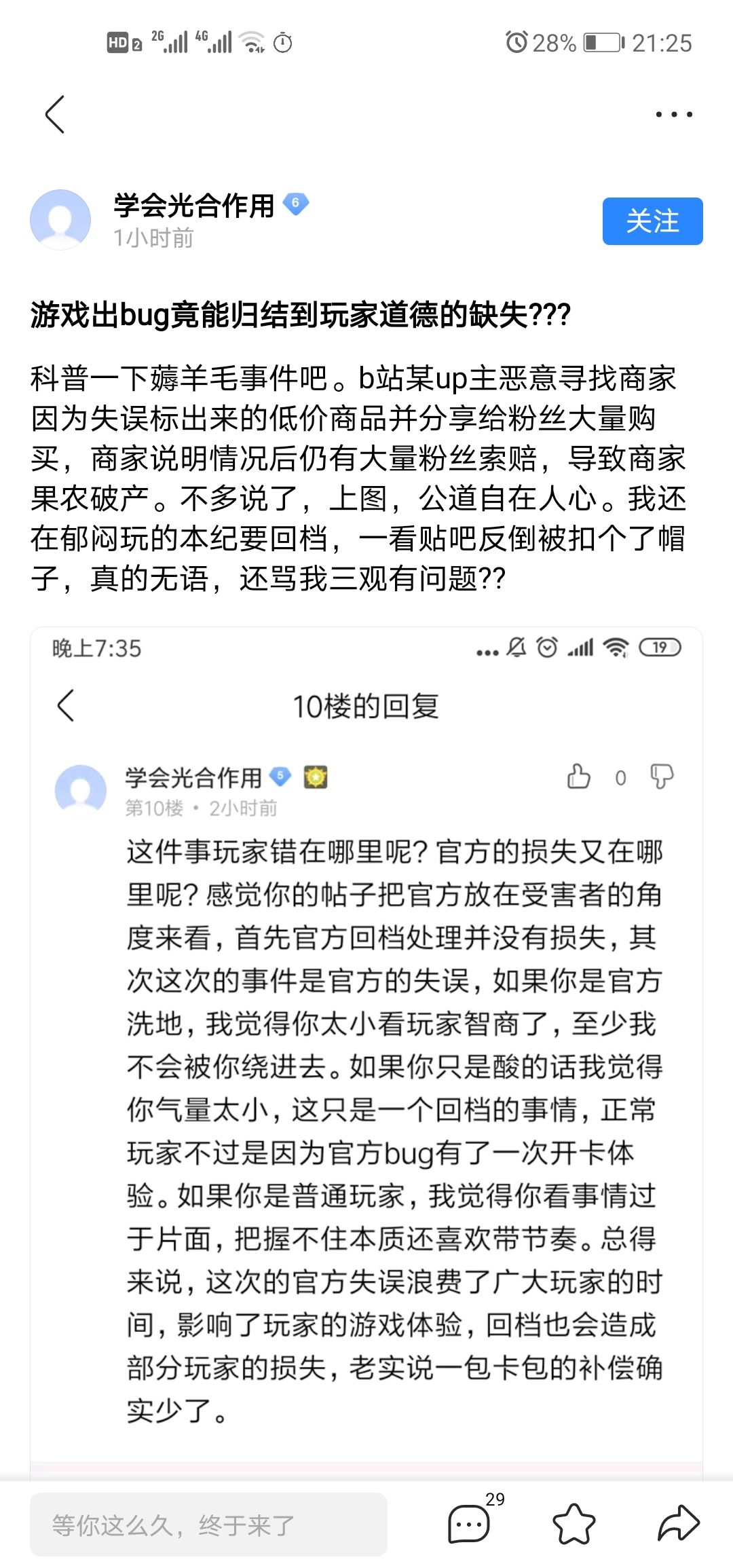 游戏工作室小比不上腾讯网易等大公司,所以出bug有理应该封禁玩家了?橘子事件是某up主恶意带粉丝搞凉了果农,可以看出法律的漏洞和某些人的道德问题,但这游戏出bug,有些玩家无意触发了bug而得利了,官方回档后本质上是没有损失的,至于官方修复bug和回档用的人力、物力、时间只是弥补官方自己造成的错误,又不是玩家的锅。如果为了官方自己的错误而封禁玩家,天凉了,这游戏也该凉了。当然如果有些玩家利用bug还嘲讽你,你可以问侯一下他们的道德问题然后拉黑举报一套就好了