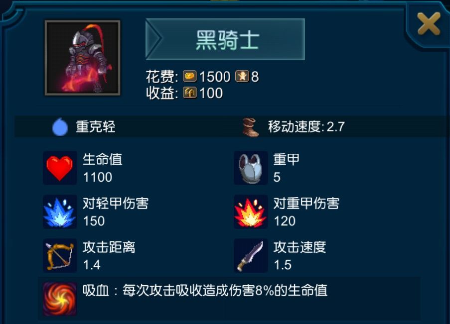 黑骑士:1中效清兵快,理由:略高攻速,偏均衡单位;2中效打反手,理由:技能效果。(移速有一丁丁快影响较小但使用时注意)