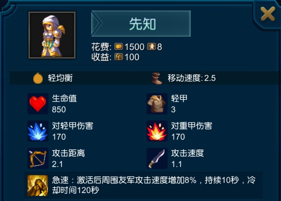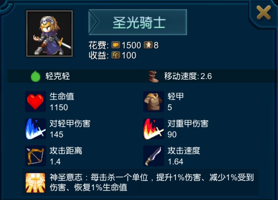 圣光骑士:1强效清兵快,理由:超高攻速(1.64恐怖);2弱效打反手,理由:技能效果;3套路克制轻甲,理由:极端克轻单位(极端单位与偏均衡单位的解释见我所编写的新手攻略)。(目前偏强单位)