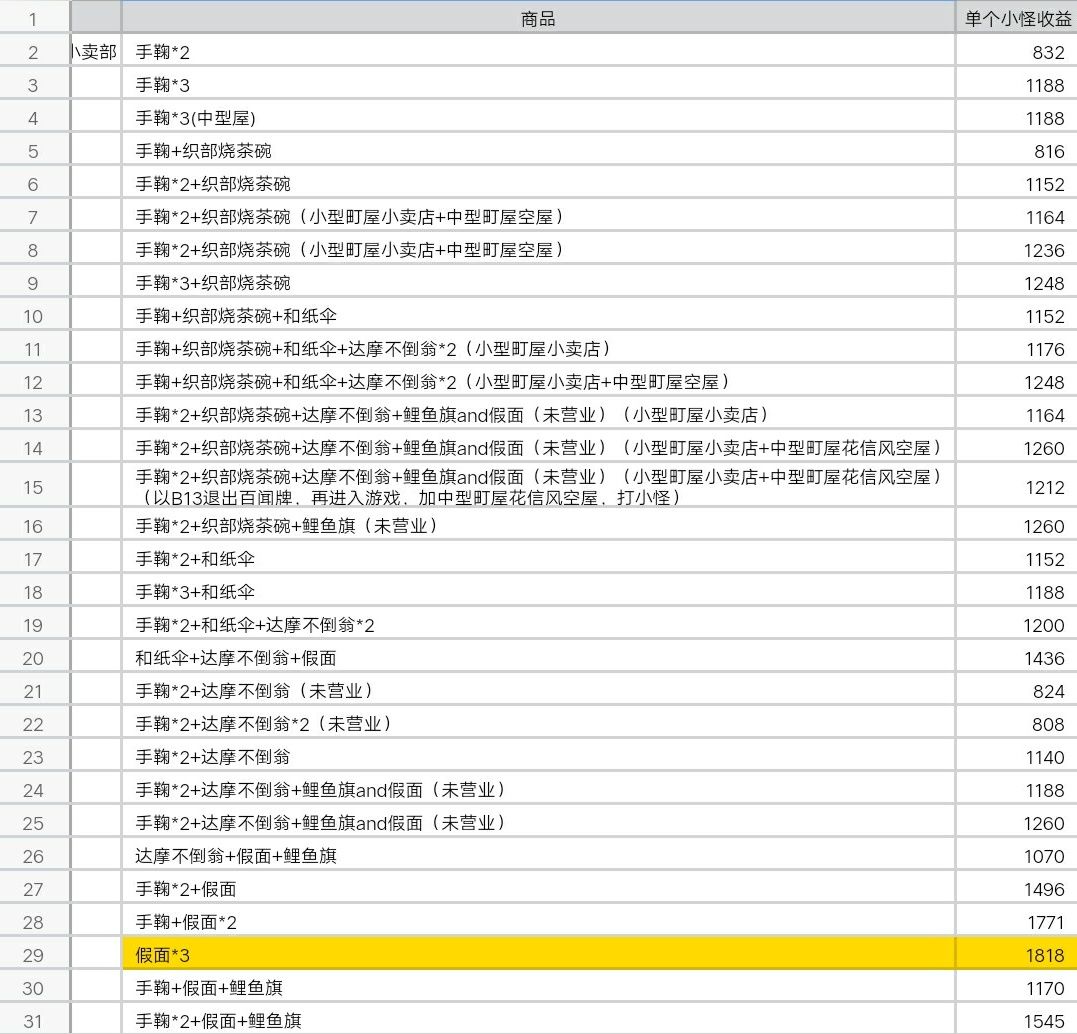 https://shimo.im/sheets/P3B0stU1rNkFVmki/ 《众人拾柴-单个店铺小怪收益测评》,可复制链接后用石墨文档 App 或小程序打开