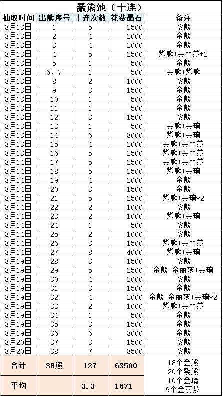 127发十连,共花63500石,出货38头熊,平均3.3发十连出货,平均成本1671石,平均出货率3.0%。其中18个金熊、20个紫熊、10个金璃、9个金丽莎。