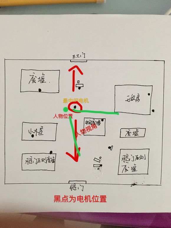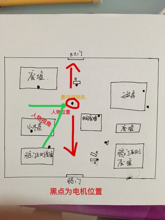 这个电机位置几乎可以看到全图最重要的几个地方。包括小木屋,无敌房,中间废墟。而且相邻的三台电机几乎最低刷新两台。这样一来这个位置就可以看到三台电机。所以把这个点作为一个参照物去记整张地图时候,就会比平时更加容易。