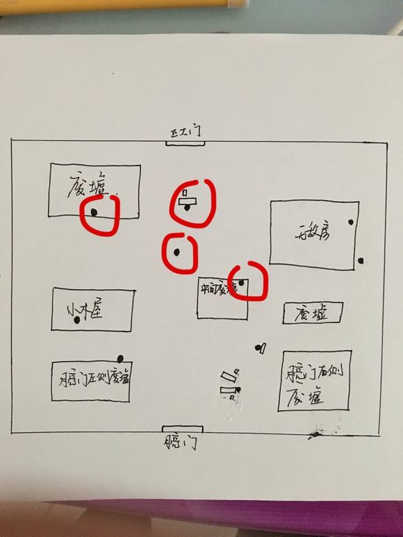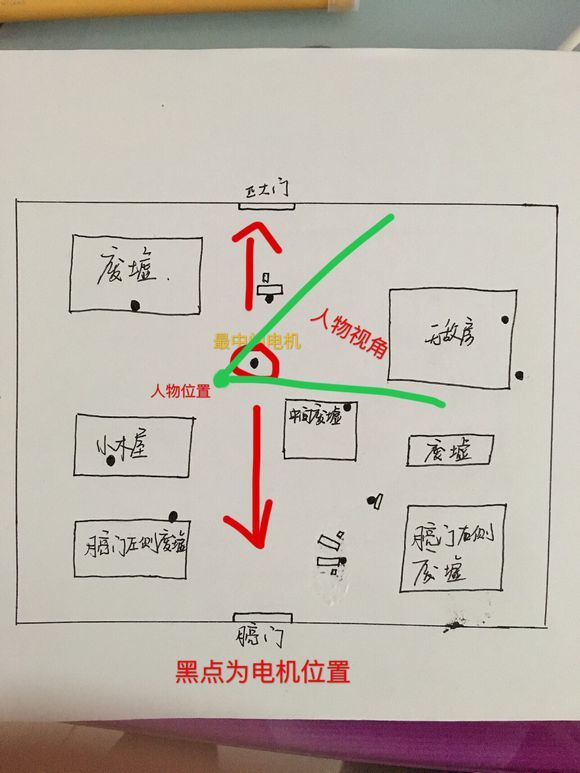 以军工厂地图为例。正大门(靠近无敌房的门)与小门(月亮门)相对应。那么这张图有一个最重要的参照物就是位于地图中间的一个靠着树的电机。