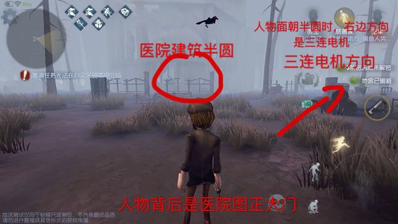 医院地图中的三连电机为医院正大门进来,人物面对医院楼半圆(医院楼突出来的一个半圆形)时候,