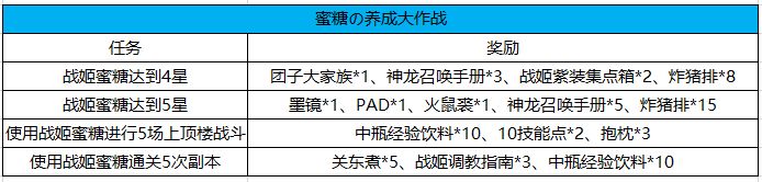 蜜糖学妹为了感谢大家对自己的喜爱,决定利用阿萌的存钱罐(划掉)开启【养成大作战】活动,完成对应的任务就可以获得蜜糖学妹送出的感谢礼哦~,具体任务和奖励请参考下面的表格吧~