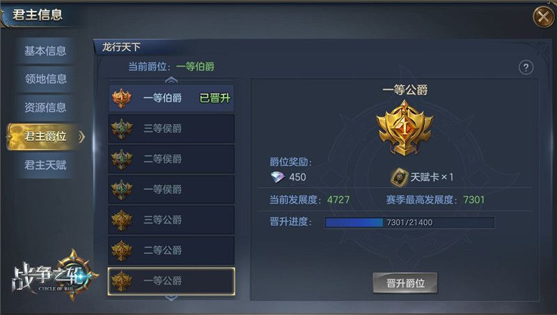 为了提高占领地块的重要性,新增了君主爵位系统,占领地块增加发展度,发展度越高可以解锁更多玩法功能并获得相应的奖励。从乡绅、骑士、男爵一直晋升到亲王,充分印证了君主大人们的成长之路,同时也是君主大人们实力的证明。
