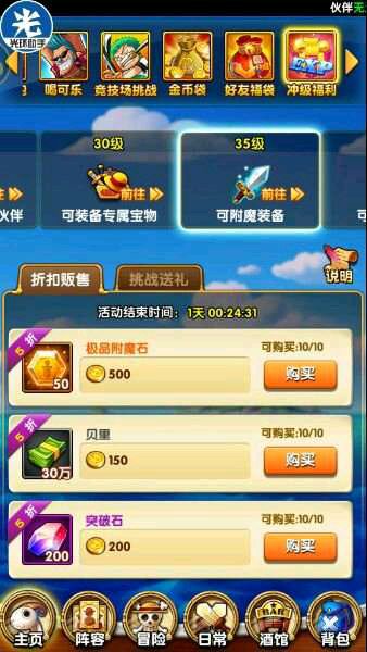 接下来到35级,附魔,贝利,突破石。。。低V楼主一个都不建议买,土豪另算,单人可考虑附魔石,单百万可考虑突破石,但也不建议,玩到后期突破石都是严重溢出的。