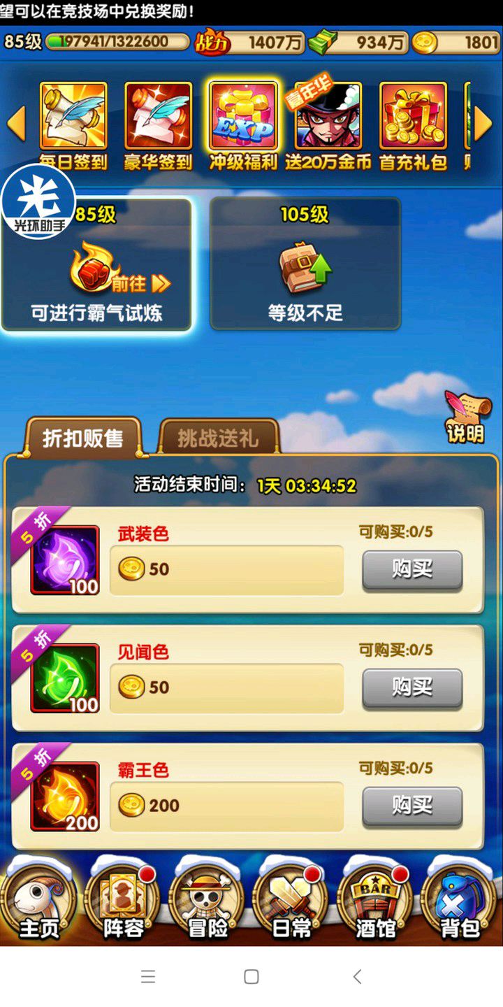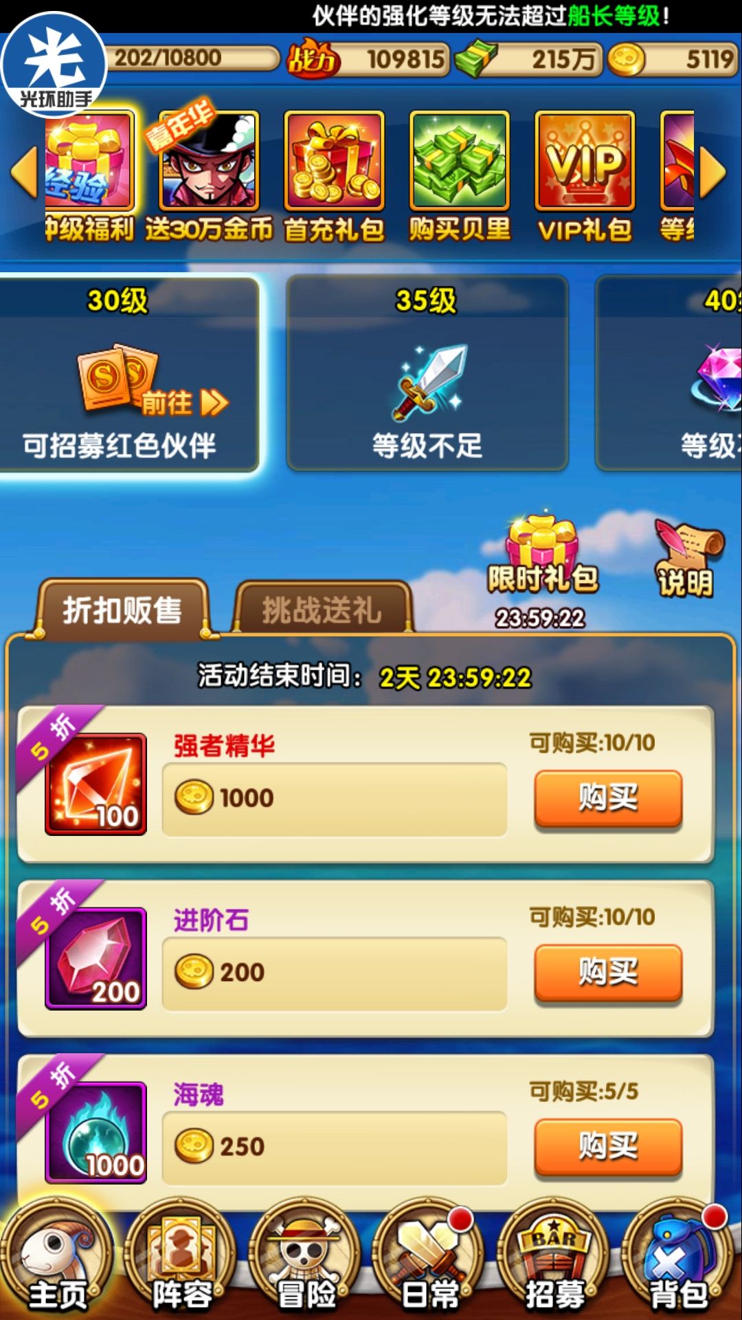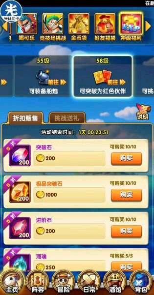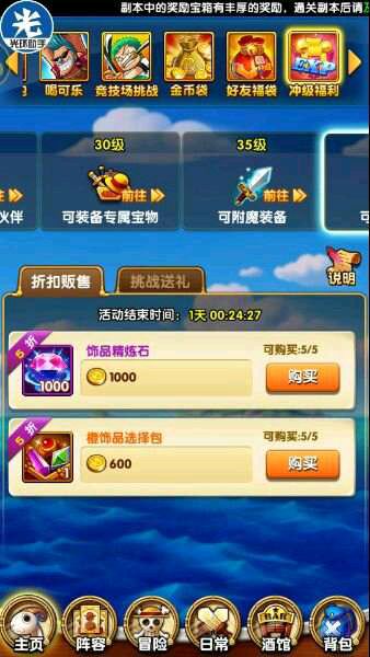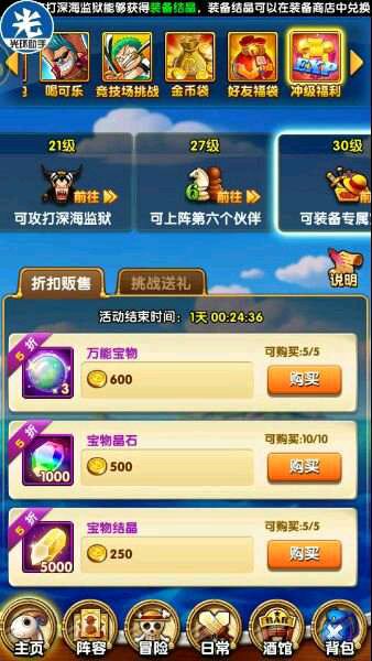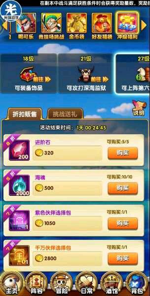 27级福利,进阶海魂低V跳过,四人阵可以买紫色伙伴选择包开山治。有人说商店十连划算,但要2800金币,而且不一定出山治,前期四人阵先出个山治,过图很给力,不是单百万卡的这里可以直接跳过,土豪另算。