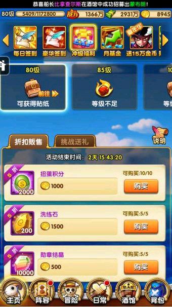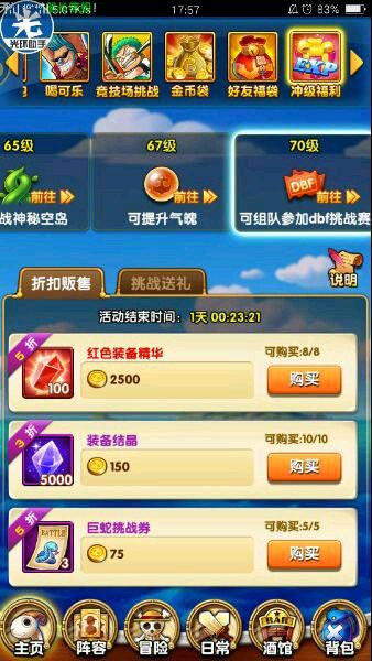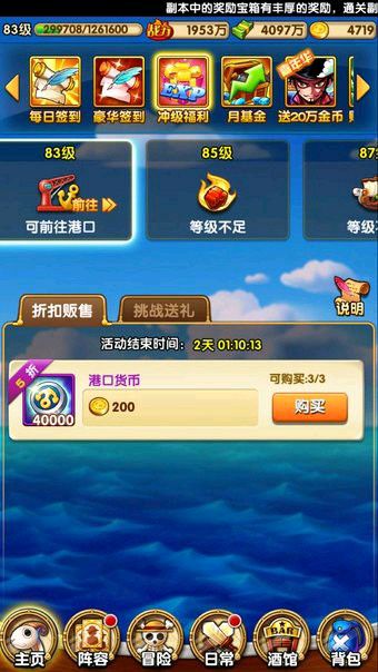 ,首先积分性价比最低,绝对不能买,洗练石是用来洗练勋章高级属性的,主要看脸,据说有人洗了十万金币都没洗到自己想要的属性,所以自己掂量,勋章结晶就不用说了,想快点出高级勋章有金币就买,没有就慢慢通关伟大航路攒。83级福利,新东西港口开启,主要用来获取饰品精华和饰品碎片,货币不建议买,这玩意你只要停船到别人家一天有两万,当然在自己家港口没到五级之前不建议把船停别人家,停自己家加港口经验和少量货币,停别人家只有货币。