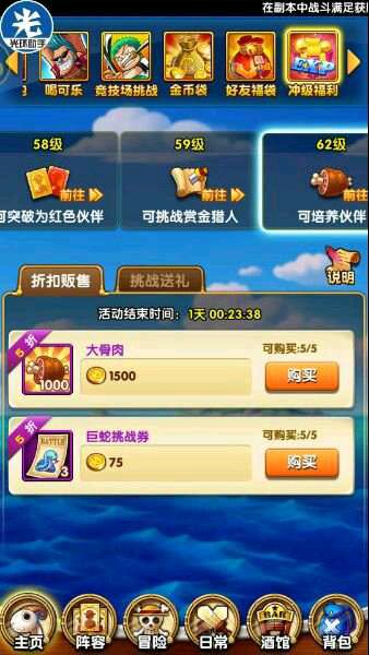 62级福利,大骨肉,培养伙伴用品,巨蛇挑战卷,贝利来源,楼主没买,一是没金币,二是性价比低,这时候贝利还不缺,土豪另算。