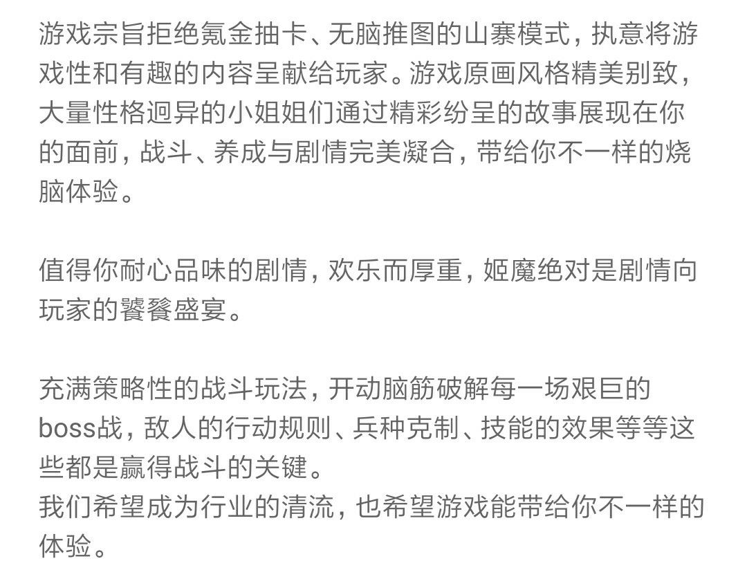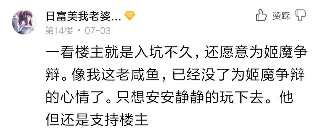 然后...贴吧炸了...各路吧友和我分享了他们的观点,其中不少人写的很长,甚至回复的写的比我发帖的都长...虽然当时那个贴有200多条回复,但是谁都没有说服谁。我就觉得姬魔是一个很良心的游戏,姬魔天下第一!最后也就不欢而散了。(我当时发帖是真的喜欢游戏,他们回复只是看透了一切,希望我也能看清楚吧,所以当时大部分人虽然反驳我,都是并没有人对我进行人身攻击,他们只当我是一个小白)
