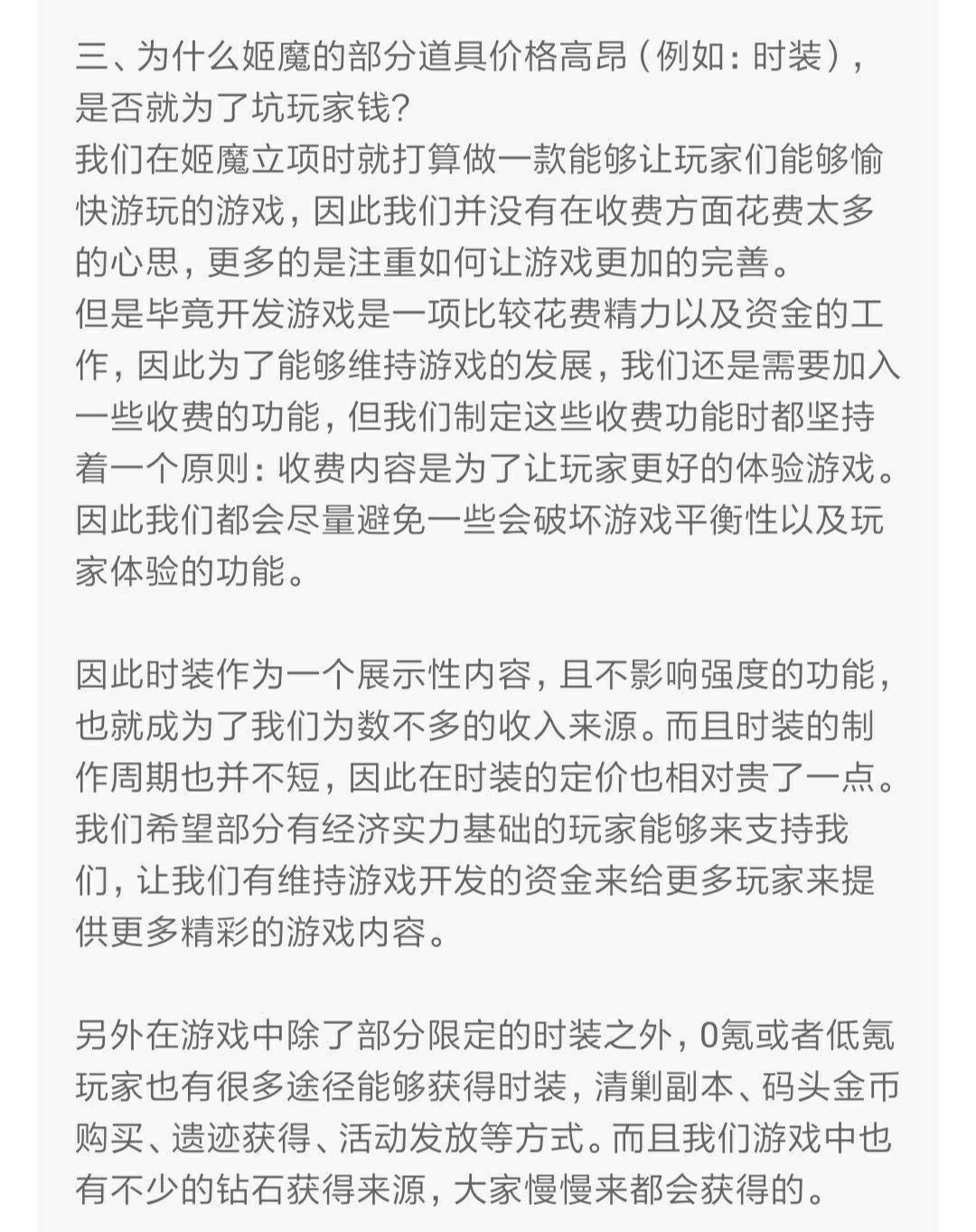 期间,我也会在tap和贴吧上浏览一些帖子,我看了官方在tap留下的一些话,大致就是,他们希望能成为行业的一股清流,这个游戏不逼氪,也拒绝无脑推图,拒绝一刀999。但是游戏总需要资金运营,他们也需要赚到一些钱。所以选择将时装做为氪金点。时装定价相对来说非常高,但是不影响游戏平衡,所以用来作为氪金点,给有能力的大佬支持游戏。当时我真的感觉这个游戏非常良心,简直完美,但是为什么不火呢?所以在之后的很长一段时间内,我都尽力支持游戏,无脑拥护,也贡献了一点点的流水。