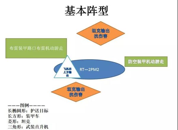 指挥可由直升机担任,直升机除了指挥外,主要对空,以及击杀残敌。火力输出、抗伤害由坦克担任,路口布雷和防空由装甲车担任。