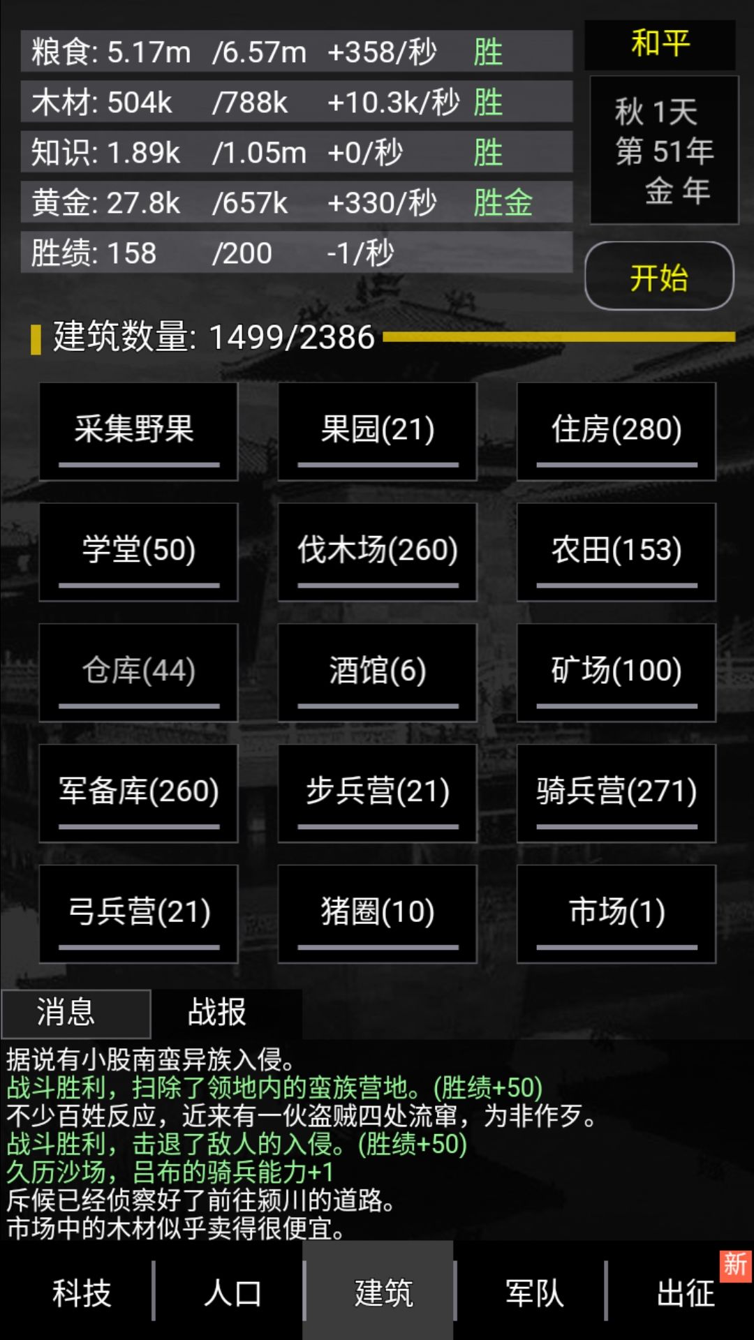 首先,游戏有粮食、木材、知识、黄金四种资源,其中粮食和黄金都是够用就行,木材多多益善,知识用来点科技,点完就没用了。