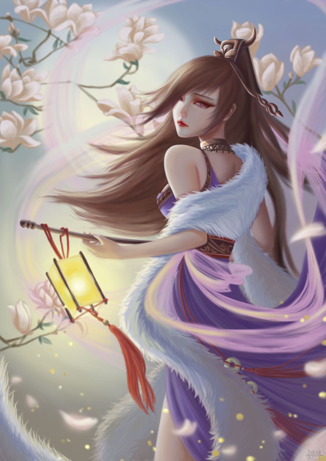 设计思路:月下花前,提灯寻归路,风起花飞舞,就连落花都怜爱着他。