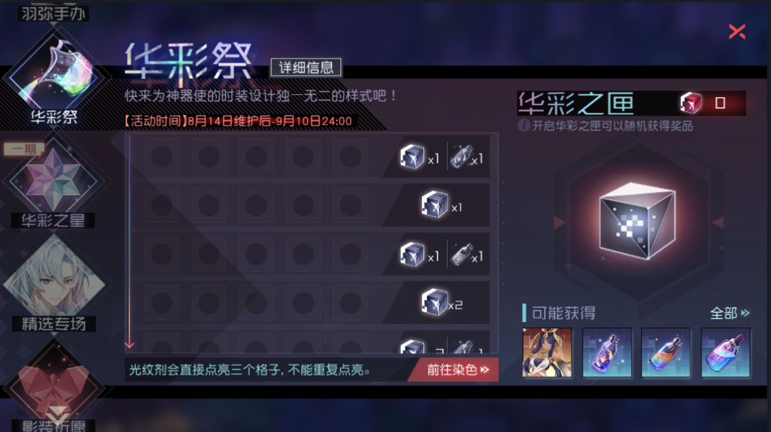 每当华彩板的颜色达到一定数量,可以领取个数不等的华彩之匣以及其它奖励。开启华彩之匣可以随机获得时装、光纹剂、染色剂等奖品。活动结束后,将无法再领取以及开启华彩之匣,请指挥使大人注意。