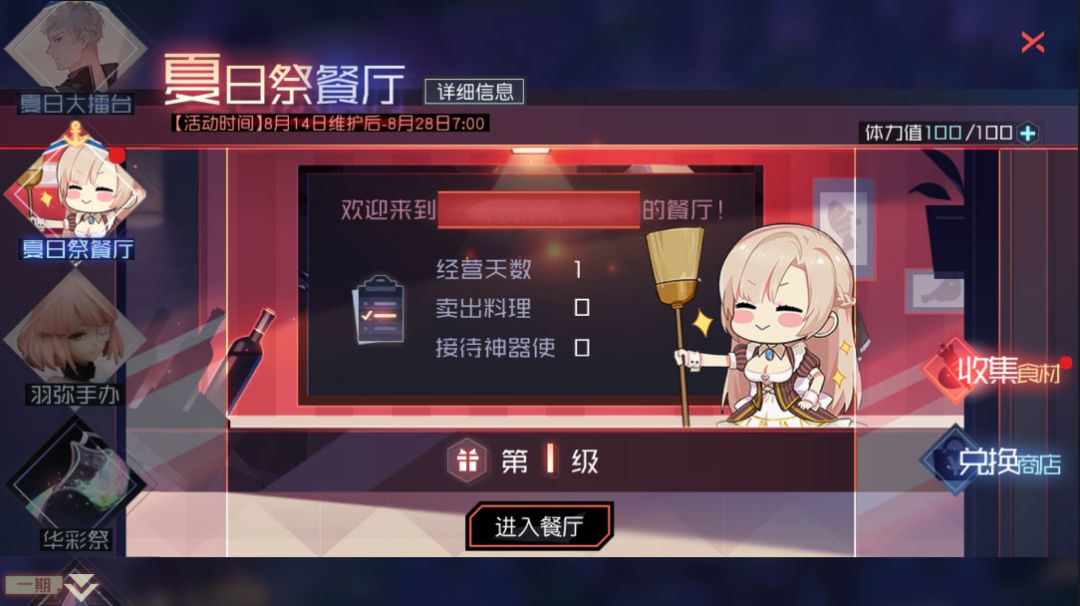 活动期间,指挥使大人可以和安一起通过副本获取食材。每次副本消耗20体力,共100体力,每6分钟回复1体力。每天11:00-14:00,副本体力消耗减半。消耗食材制作料理,不同料理需要的食材种类和数量不同。料理完成后,经过一段0-30分钟不等的随机时间,会有神器使出现用餐。可能出现的顾客神器使共有20人,分超稀有、稀有、普通三个稀有度等级,不同稀有度等级的神器使有不同的刷新概率。卖出料理、接待神器使,将会增加店铺经验。提升店铺等级,解锁菜谱、餐桌等内容。活动奖励: