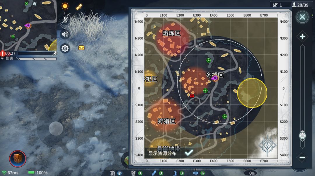 打开大地图可以看迷雾范围,白色圆圈表示下一个安全区域的范围,而黄色迷雾弥漫的地方,就是危险区了。大家要随时注意迷雾的范围和推进时间,免得掉血。