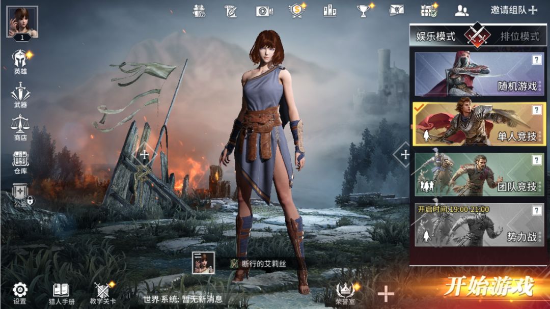 角色创建和新手剧情这些小编就不罗嗦啦,跟着系统指引一步步来就好了。跳过这些,我们首先来到游戏大厅,选择单人竞技模式(当然你也可以选择随机、团队这些,小编只是偏爱一个人战斗)进入战场。