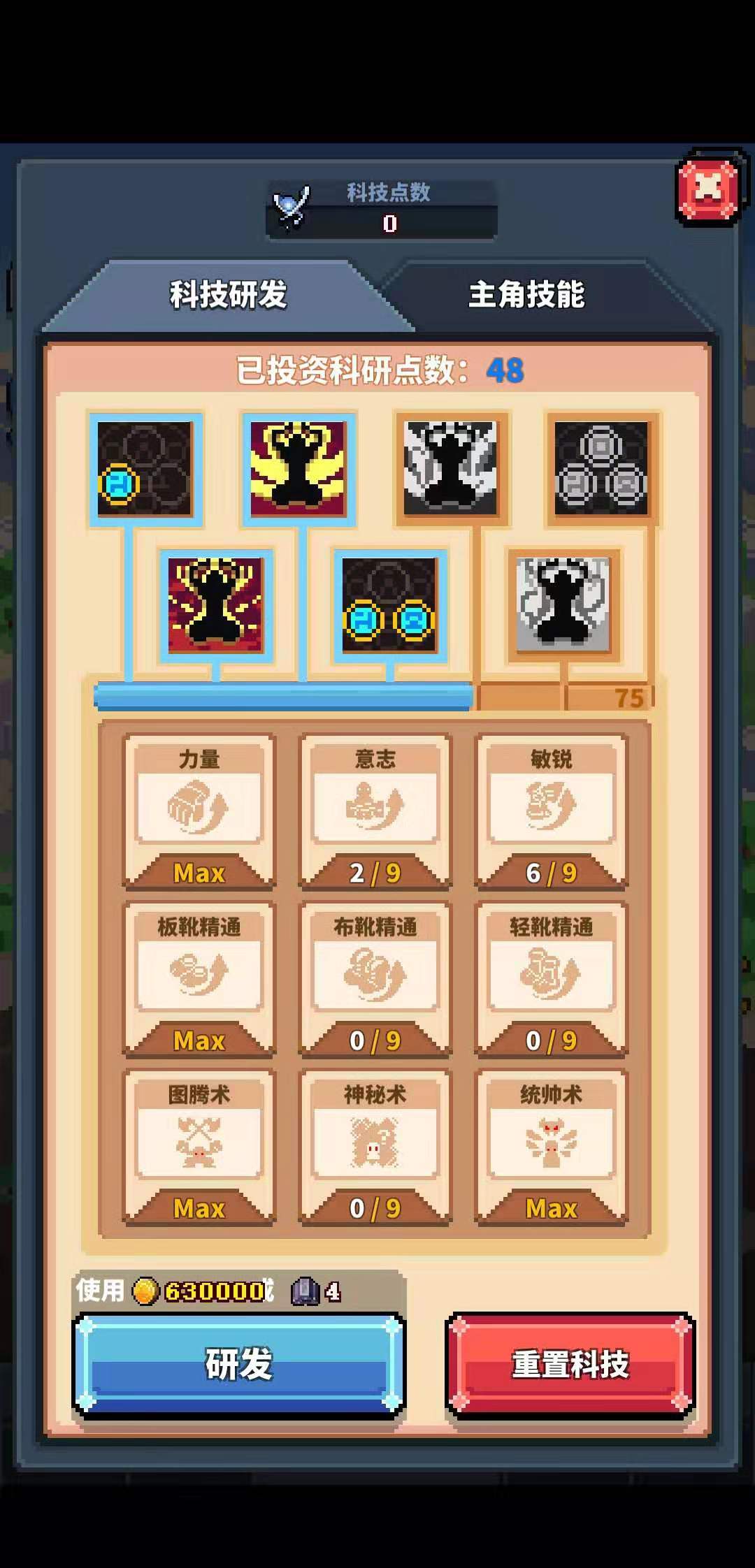 主角技能以及勇者属性提升区域,前期建议使用金币后期使用智慧之晶,猪脚技能更具自身使用武器进行搭配,我的是枪手。