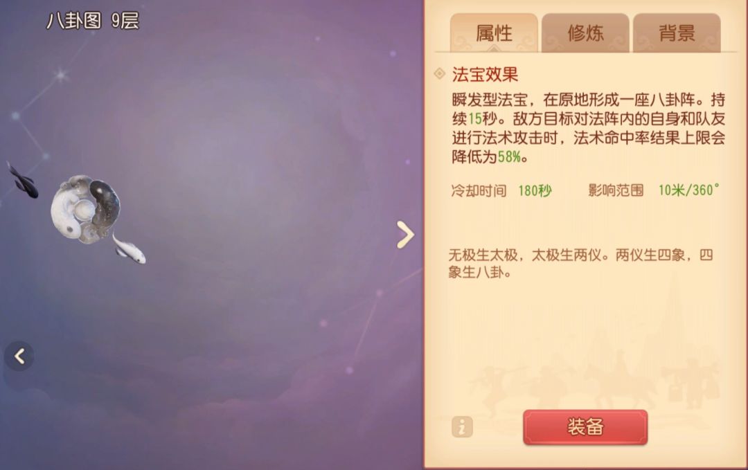 布下八卦图之后,使10米范围内敌方的法术命中率降低。