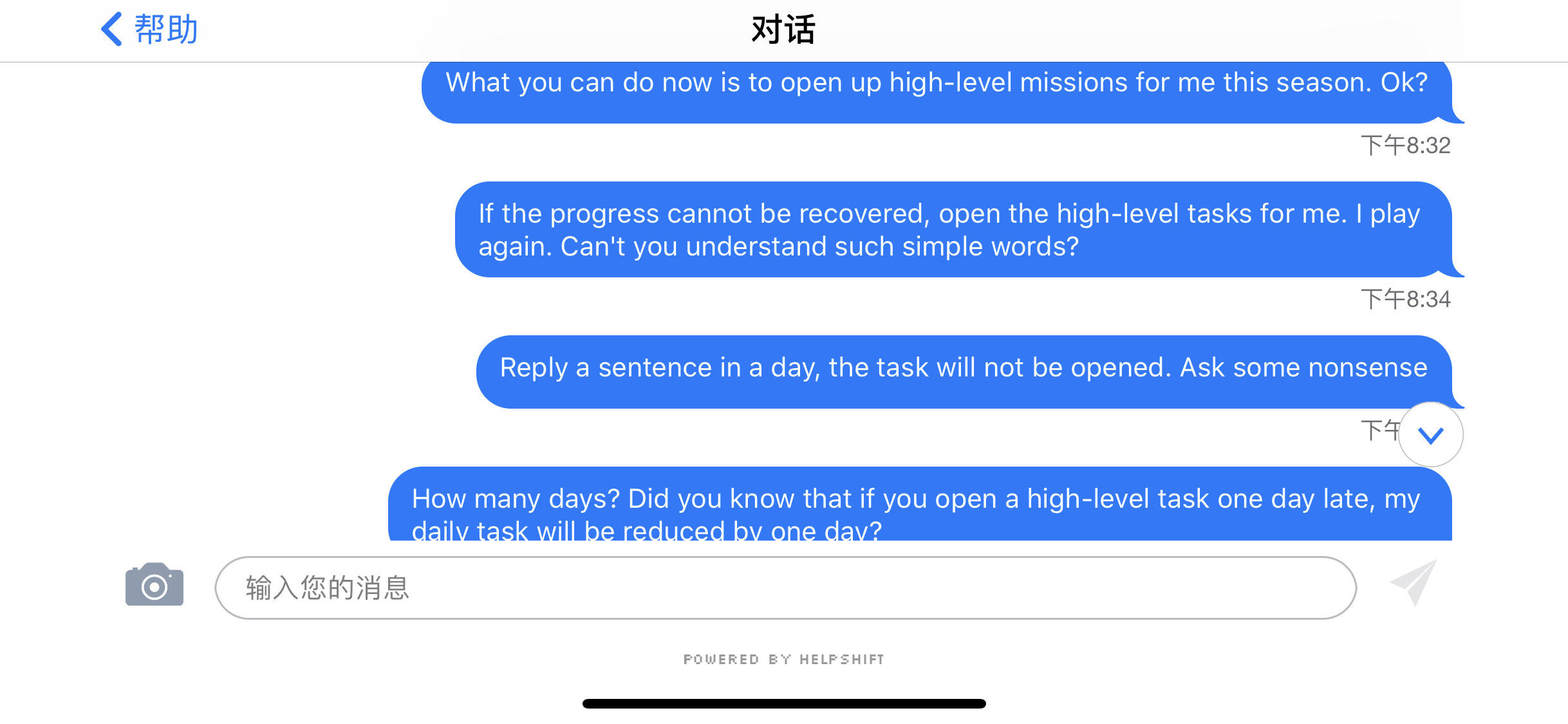 我花钱买了高级任务 但是进度丢失了,变成了没买高任务之前 ,我就找客服 我说实在不行进度丢就丢了我可以重新玩,你只要把高级任务为了打开就行了,他们的**客服 一天回我一句,第一问我 你现在什么情况 我说请你打开高级任务,理由我也说明了,第二天 还在问我废话,第三天我说你给我打开高级任务, 他说感谢你的信息 找开发商 我他妈要气死了,明明为我解锁下高级任务 就完事了 拖了我一个礼拜 然而高级任务还不给我解锁