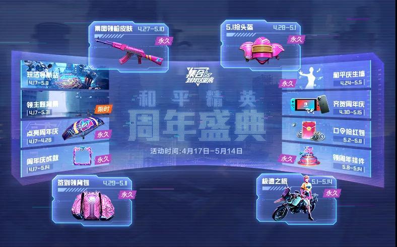 北京时间5月2日-5月8日,每日在经典模式下拾取或参与周年庆蛋糕玩法均可获得获取周年庆口令卡,结算完成返回大厅后可触发活动,分享后通过语音解锁口令卡获得现金/Q币红包,物资币,荣耀勋章,幸运币等奖励;