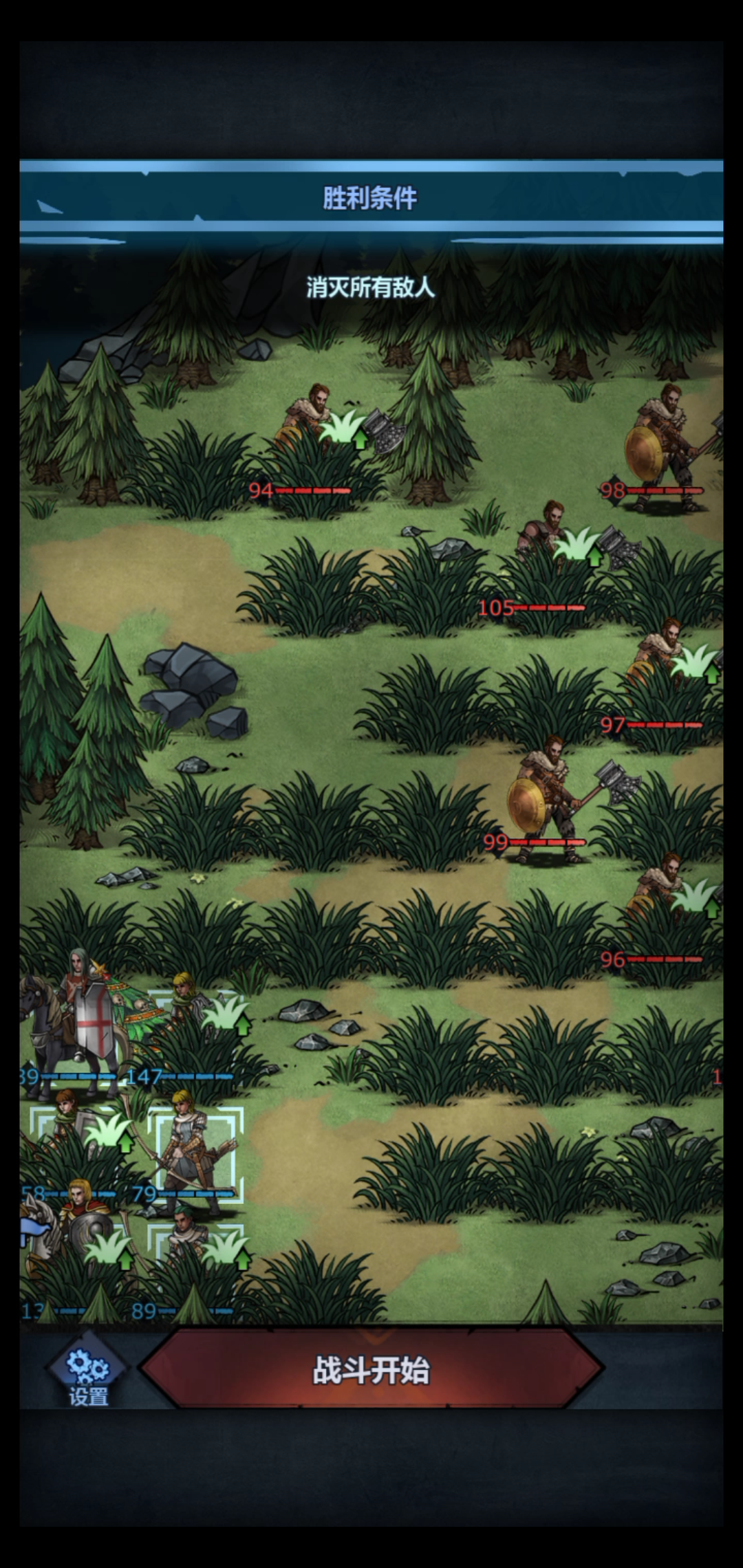划重点:这个任务的地形是在一片草丛里,每次只能移动一步(注:刺客不受该地形影响,禁卫最好带个援护当工具人),懂得拉扯是其中关键,皇骑只能反击一次,有无限反击、超强招架以及孤儿斩的大剑可以考虑一带五