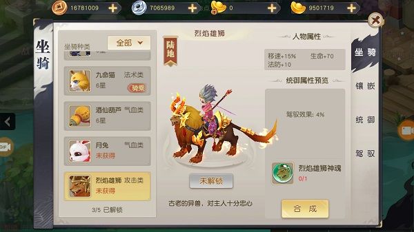 率先登场的,是威风凛凛的烈焰雄狮,身披金色盔甲,烈焰在铠甲的边缘灼出滚烫的波纹,红色的鬃毛随风而动,极具力量感的体格,让你在骑乘状态下彰显出强者的气势,烈焰雄狮为玩家次充礼包中的福利,想要获取的朋友千万不要错过。