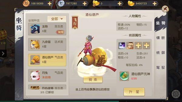 压轴登场的自然就是能够御空飞行的酒仙葫芦,他是目前所有坐骑中唯一款可以跨越地形的炫酷坐骑,悬浮的金纹特效在葫芦周边旋绕,破云而行的酒仙葫芦,陪你遨游三界九幽,上天入地,无所不能!