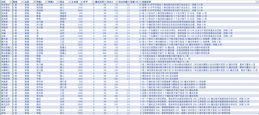 所有 1 费棋子普通攻击数据如下: