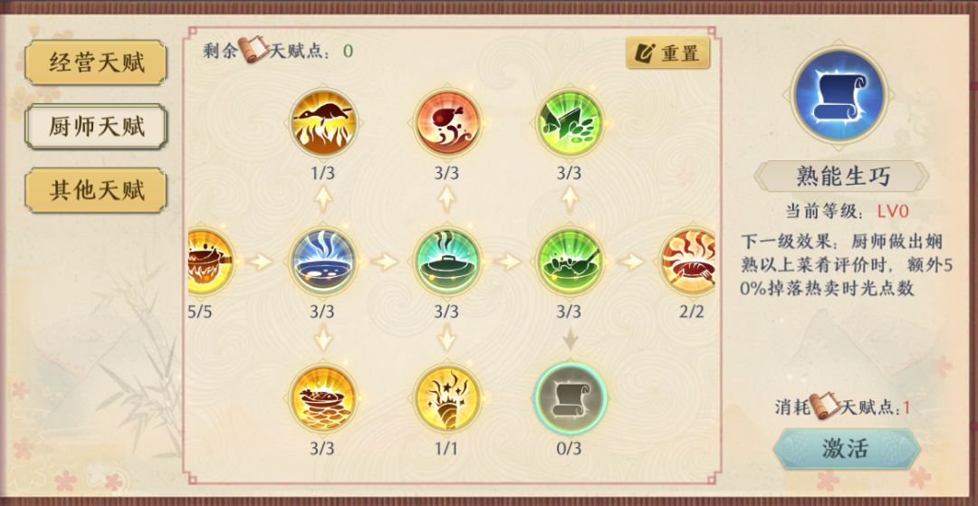 昨天晚上把天赋全换成了厨师天赋烤技暂时没有天赋点能点了(熟能生巧实际上对于收益上限没有影响)