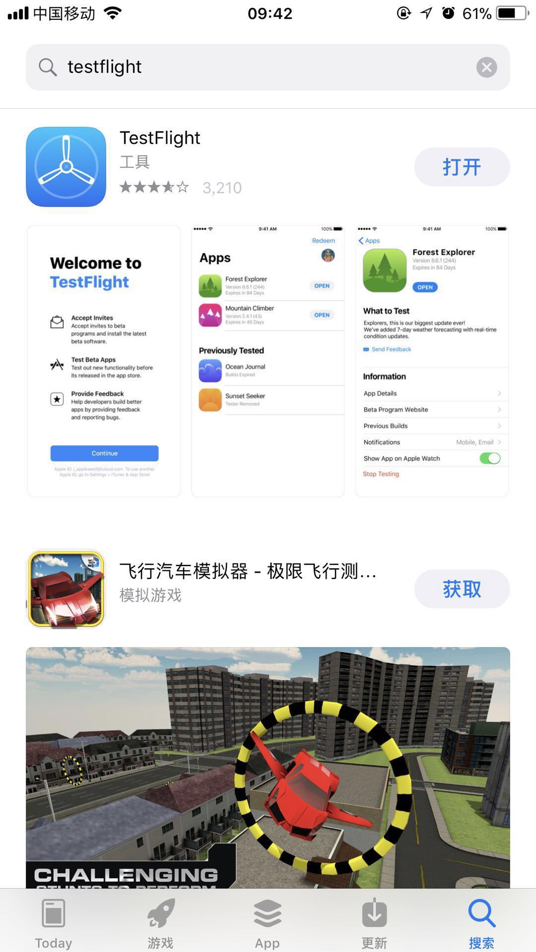 1. 苹果应用商店内搜索TestFlight,然后点击“获取”以后安装,如下图所示。