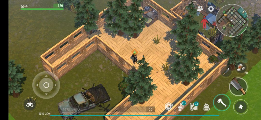 上方树挡着有个工作台,有木头和木板,就一个盒子,卡车有东西,新手武器和衣服。