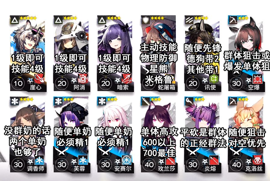 阵容如图,100信赖的话输出、盾、奶精1 20级就够了,低信赖30~40级。特种不需要等级,技能升4就行,阿消求稳可以升到1000血量防止被秒。