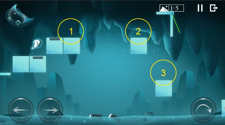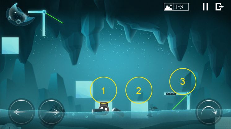 接上图,水珠人在位置1的时候,应该还是有大气泡包围的,这样就可以跳到位置2。如果没有大气泡,就只能跳污水里了。在位置2的时候,要观察位置3的移动情况,因为位置3的方块是左右移动的,像上图这种距离是安全的,水珠人可以由位置2走落到位置3。这个距离有点高,玩家需要克服紧张的心情^_^
