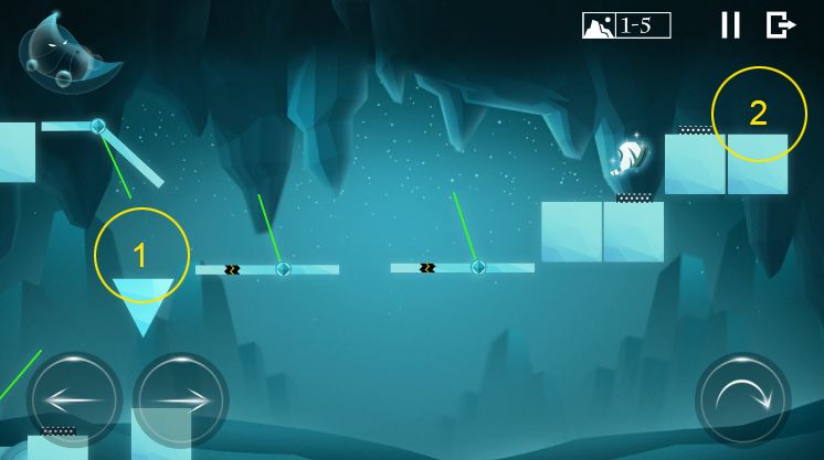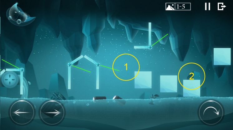 接上图,来到这个位置不要盲目往前冲,因为冲不了两秒,你就会发现这两个高度跳不上去。所以要先去位置1的三角形,让大气泡包围起来,再迅速跳到位置2,大气泡的有效时间是12秒,所以,只要淡定一点,水珠人是可以带着大气泡到达位置2的,当然,中途记得拾取碎片和留心海绵。