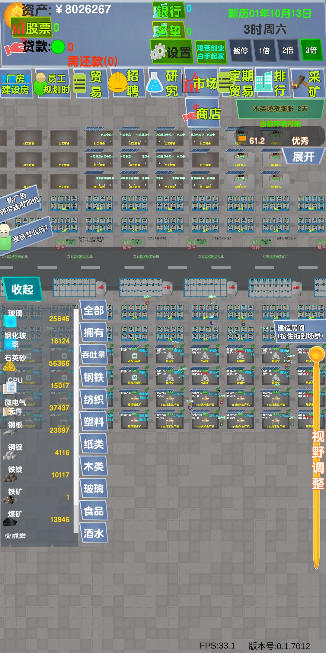 首先一定要有大局观,你的厂房怎么规划更好发展(建议分区 如宿舍区 研究区 厂房区 仓库区)仓库一定挨着路边,后期货量大有资金安装自动分拣。新手建议做钢铁,价格幅度大,容易发展。首先前期做2个仓库和一个铁锭机房一个宿舍 招募几个搬运工就可以了。看好行情出单,一般铁锭价格在5左右。但是我的主流不是生产,而是生产+投机,等到某一类物品通货膨胀价格大跌的时候,贷70000左右,那一半多做几个机房和仓库。然后大量购入。过一段时间价格回涨的时候卖掉。比如说我是做钢板的。钢铁类通货膨胀的时候,我把铁锭钢锭等原材料累积,然后直接大量入钢板成品。价格回暖的时候倒手能翻3倍左右。第一桶金得到以后着手研究所。然后看广告加速。然后给自己装净化和太阳能(后期耗电大,甚至一个月收入不够交电费。)然后按照这个模式一直转下去。钱太多不要存银行。买股票更赚