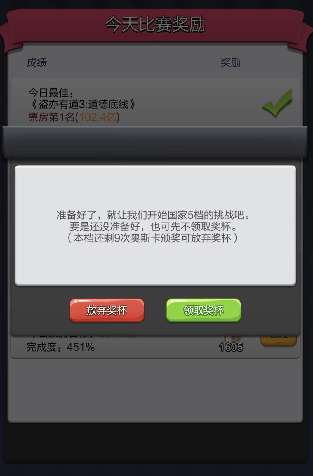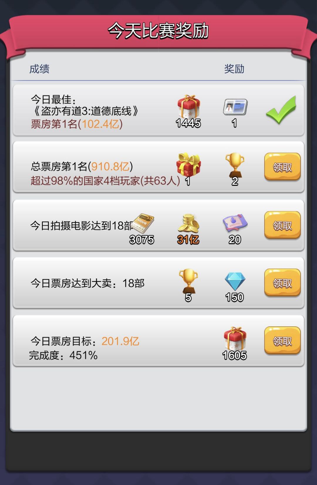 这类玩家,每个档位都会“卡满”,所谓卡档,就是在当前档位不急着升档进入下一个档位。每天正常拍摄剧本,但是在升档的时候,会放弃奥斯卡奖杯的领取直到被迫无奈被系统硬逼着进入下一档位。虽然在区服内遭受着非人的屈辱,但是在同档位的玩家朋友中,却能够拥有鹤立鸡群的高票房在集团群里截图装X,甚至在每周的集团战中一路披荆斩棘,吊打同组其他四位可怜的普通玩家。