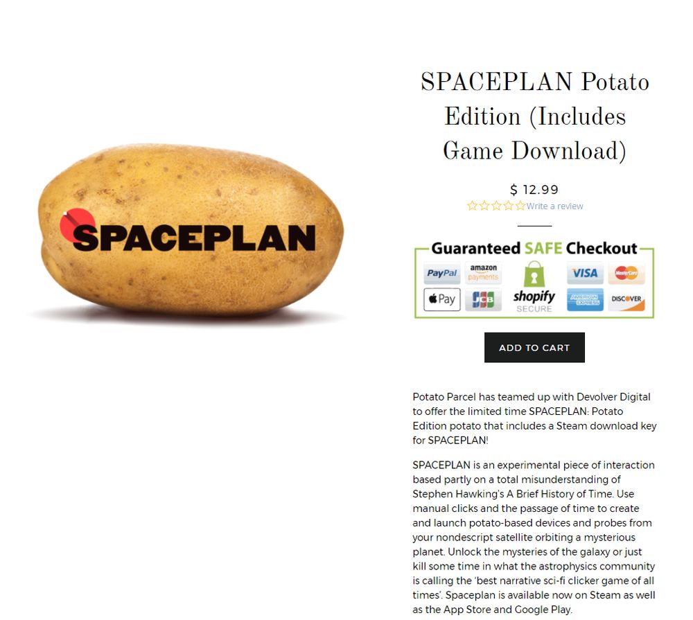 需要说明的是,这款游戏的发掘者是Devolver Digital,不了解的朋友可以点击这里看看他们都干过什么。事实上,早在2016年,Jake Hollands就已经放出免费的《Spaceplan》网页原型版,其玩法与内容和现在你将要玩到的并无二致。至于Devolver是怎么找到它的,这个完全不得而知。为了表示对宇宙、生命以及一切的尊重,Devolver在之后的销售过程中还找到美国的“个性化土豆电商企业” Potato Parcel 合作,特别推出“Potato Edition”,也就是一颗印着LOGO的土豆,加上下载码。