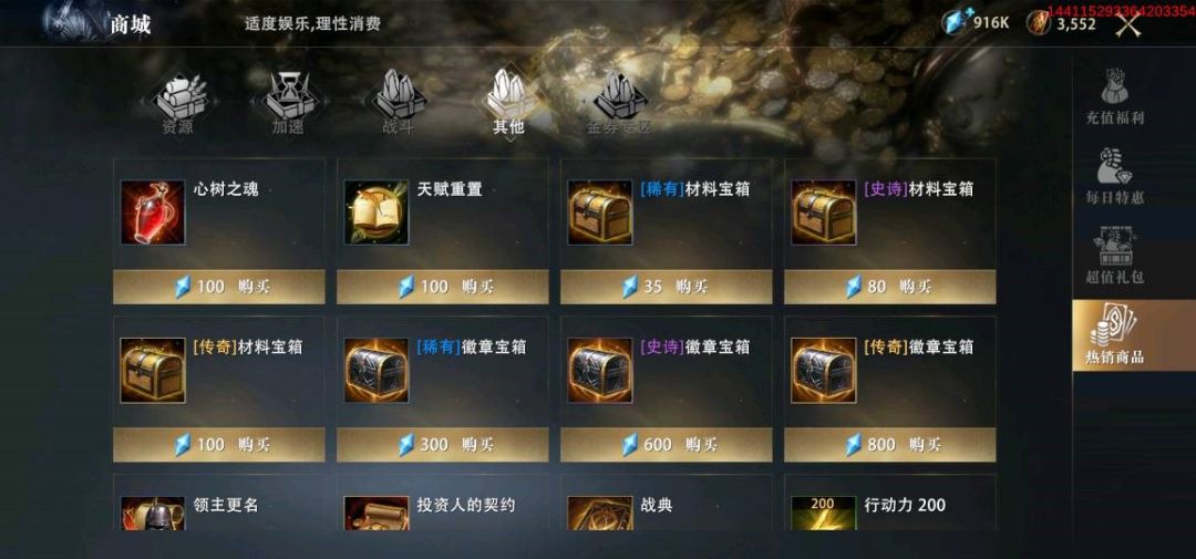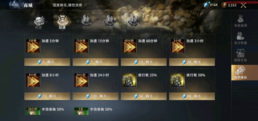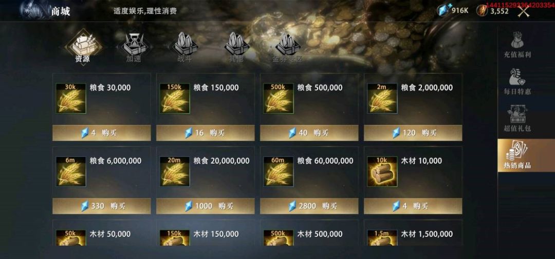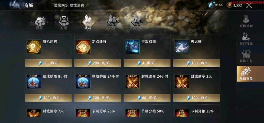 此界面包含资源、加速、战斗、其他与金券专区多个分类别热销商品。领主们可在此查看哪个商品出售最火热,并酌情考量自己是否需要。
