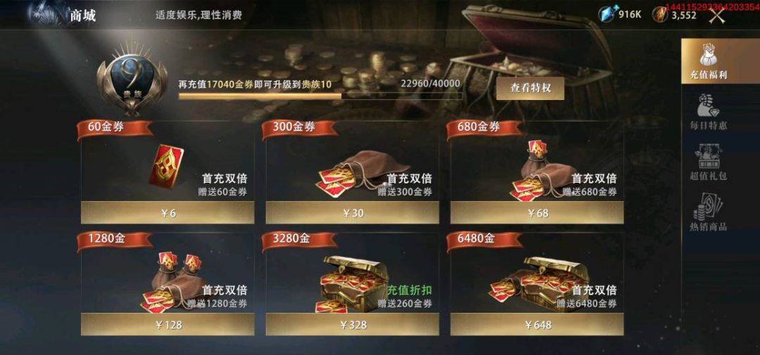 在此界面可进行金券充值,首次充值各个充值面值可享首充双倍、充值折扣等福利。