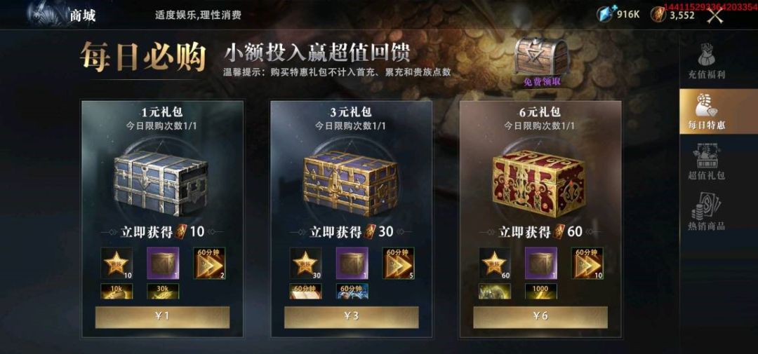 每日特惠礼包可通过小额投入赢超值回馈,包含1元礼包、3元礼包与6元礼包3个礼包种类,每个礼包每日限购一次,且购买此特惠礼包不计入首充、累充和贵族点数。