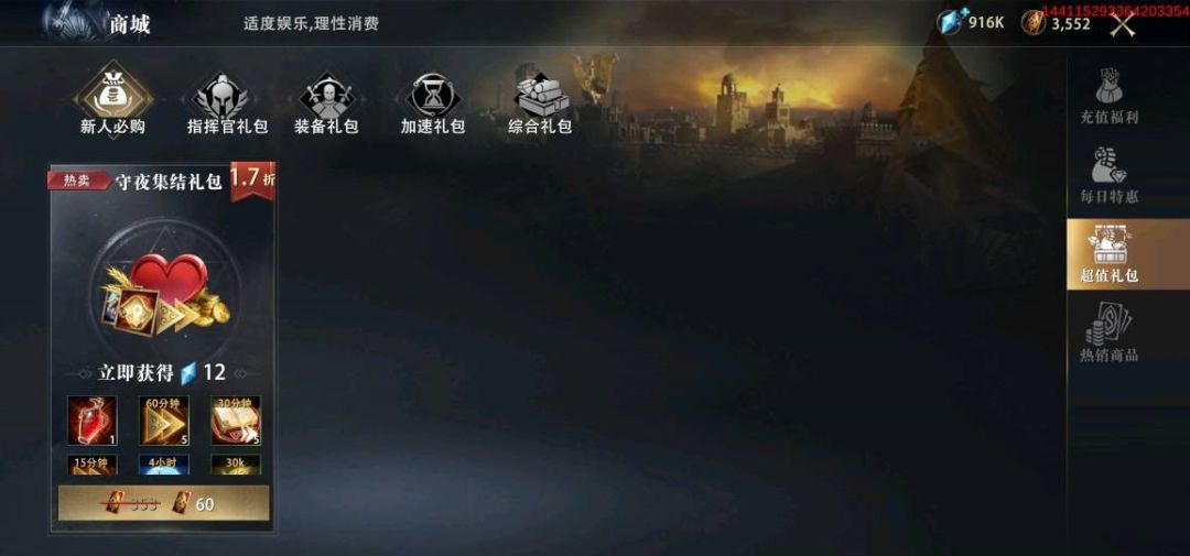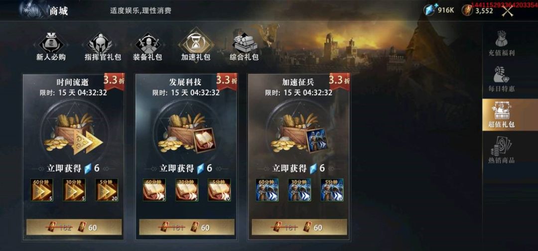 超值礼包分有新人必购、指挥官礼包、装备礼包、加速礼包与综合礼包5个礼包类别。