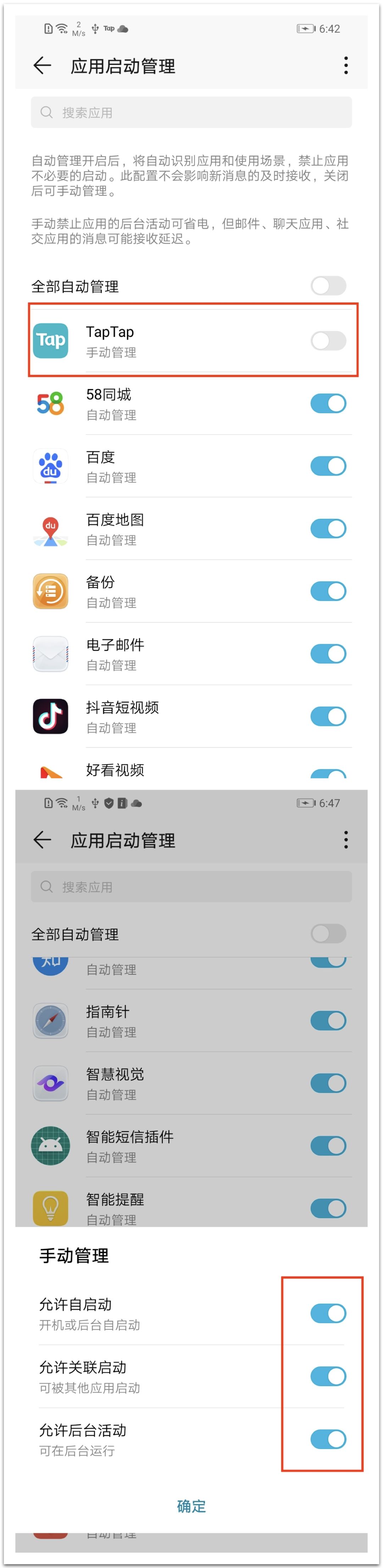1.应用启动管理方式:手机管家---->应用启动管理---->TapTap选择手动管理---->打开所有允许开关